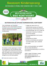 Welcome to BSO Kortvoort, part of Zonova childcare. We provide after-school care for children aged 4 to 12 in the school building at Kortvoort 61A, Amsterdam Zuidoost. Our BSO is open every weekday from 14:00 to 18:30. During school holidays and study days we welcome children for the full day, from 08:30 to 18:30.