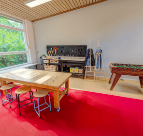Our spacious group room is set up like a real ‘home after school’. Different corners invite children to choose whatever appeals to them at that moment: a creative table full of craft supplies, a quiet reading nook with cushions and books, a construction area with LEGO and Kapla, and a cosy dining table where we share drinks and a biscuit. Large windows flood the room with light and provide a free view of the playground, so the indoors and outdoors blend together naturally.