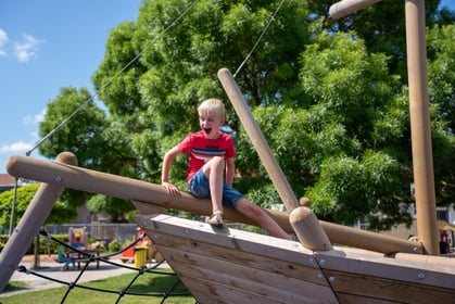 Once they arrive, a world of play and discovery awaits. Children dig in the large sandpit, climb and scramble on the adventurous play structure, and set sail on the wooden boat using nothing but imagination. On the sports court they can play football or basketball, and the bravest ones take a ride on the zip-line. The natural setting of the playground invites outdoor play in every season, and we spend as much time outside as possible.
