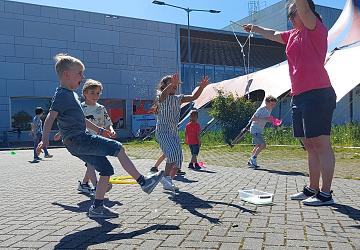 What makes us extra special: we are certified climbing instructors and have access to the climbing wall in SKWA. A unique opportunity for children to discover this challenging sport! Additionally, on Tuesdays and Thursdays we offer pick-up and drop-off service for gymnastics, judo or swimming lessons in the same complex. So you don't have to wait in the warm swimming pool – we bring and pick up your child and take the access card back for you.