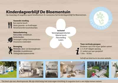 Welkom bij Kinderdagverblijf De Bloementuin, gevestigd op Kerkweg 225 in hartje Heemskerk. Wij zijn een professioneel kinderdagverblijf en maken onderdeel uit van Kindcentrum St. Leonardus. Onze locatie biedt op werkdagen van 07:30 tot 18:30 uur opvang aan maximaal 40 kinderen in de leeftijd van 0 tot 4 jaar, verdeeld over twee horizontale groepen: De Lieveheersbeestjes en De Libellen. Elke groep biedt plaats aan 12 kinderen en wordt begeleid door minstens twee gediplomeerde pedagogisch medewerkers.