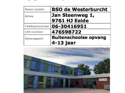 Welkom bij BSO Eelde IKC De Westerburcht, dé plek voor buitenschoolse opvang in hartje Eelde. Wij zijn gevestigd op Jan Steenweg 1, op het terrein van Integraal Kindcentrum De Westerburcht, en bieden opvang aan maximaal 132 kinderen in de leeftijd van 4 tot 13 jaar. Als onderdeel van Kids First werken wij intensief samen met de basisschool en vormen we één hecht team voor onderwijs én kinderopvang. Onze kinderen komen uit de directe omgeving: de Bloemenbuurt, Spierveen en verder uit heel Eelde-Paterswolde.