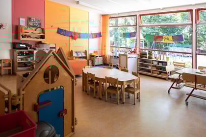 Onze ruimte bestaat uit twee verbindende klaslokalen die we delen met de jongste kleuters van de school. De bouwhoek en huishoek zijn speciaal ingericht voor peuters, met materiaal op maat en uitdagende hoeken die de fantasie prikkelen. Wanneer de peuters behoefte hebben aan rust, schuiven we de deur dicht en creëren we een eigen knusse plek voor knutselen of voorlezen.
