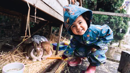 De dag start altijd gezamenlijk rond een echt kampvuur, waarna we samen alle dieren op ons terrein een goedemorgen komen brengen. Onze kinderen leren kippen, geiten, konijnen, cavia's, varkens en zelfs slangen en schildpadden van dichtbij kennen en mogen ze knuffelen en verzorgen. In onze eigen moestuin kweken we groenten, bakken we zandtaartjes in de modderkeuken en gaan we op avontuur door het peuterbos. We geloven erin dat kinderen door veel buiten te zijn en met de natuur in contact te komen, hun zintuigen en motoriek optimaal ontwikkelen.