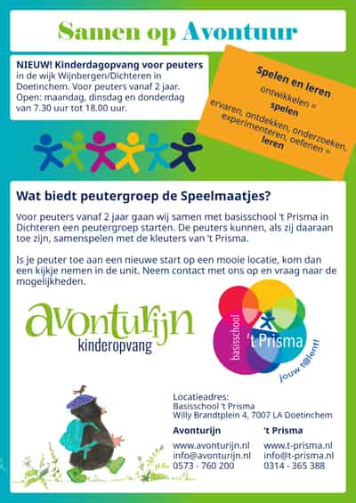 Peutergroep de Speelmaatjes is een kinderdagopvanggroep speciaal voor peuters vanaf 2 jaar. Wij zijn gevestigd op Willy Brandtplein 4 in Doetinchem en maken onderdeel uit van Kindcentrum Avonturijn. Onze groep is op maandag, dinsdag en donderdag geopend van 07.30 uur tot 18.00 uur gedurende 52 weken per jaar. De peuters kunnen, als zij daaraan toe zijn, samenspelen met de kleuters van ‘t Prisma. Dit is een mooie samenwerking tussen basisschool 't Prisma en Avonturijn.