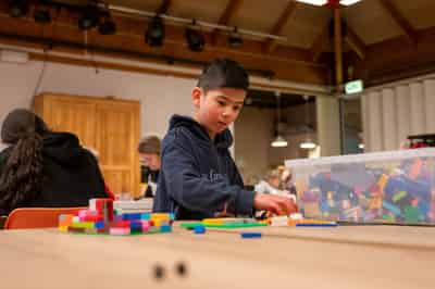 We zijn veel buiten. We spelen spelletjes op het schoolplein of maken uitstapjes naar de speeltuin, het Buytenpark, de winkels in het centrum en kinderboerderij het Geertje. Binnen gebruiken we de grote aula van de school. We spelen op het podium, met de tafelvoetbal en in de poppenhoek, bouwen creaties met LEGO of pakken een bordspel uit de spellenkast.