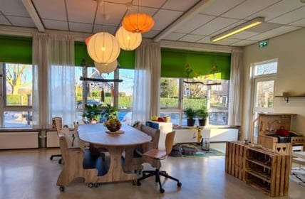 We delen de ingang met de school, maar hebben onze eigen, veilige ruimte die volledig is ingericht op de behoeften van de allerkleinsten. Buiten maken de kinderen gebruik van de schooltuin en natuurspeelplek; groen en bewegen staan centraal in onze dagelijkse activiteiten. KDV Chapeau Est is al jaren gecertificeerd met het Kwaliteitsmerk Groene Kinderopvang. Dit betekent dat we structureel aandacht besteden aan natuur- en milieu-educatie, gezonde voeding en veel buitenspel. Elk jaar vieren we ‘De Dag van de Groene Kinderopvang’ en werken we thematisch rond seizoenen, planten en dieren.