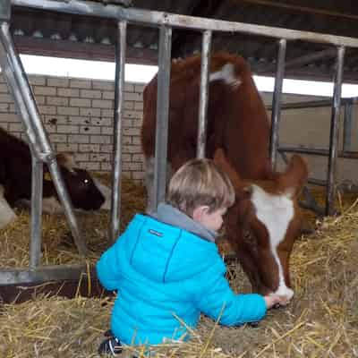 Onze groepsruimtes zijn knus en huiselijk ingericht. In elke groep vind je een commode, een keukenhoek en een kinder-wc. De slaapkamer grenst direct aan de groepsruimte en biedt rust en vertrouwdheid. Vanuit de groep kunnen de kinderen via een raam meekijken in onze stal, waar koeien en een paardje vrij rondlopen. Bij slecht weer kunnen de kinderen binnen in de stal spelen, klimmen op hooi en stro en de dieren voeren.