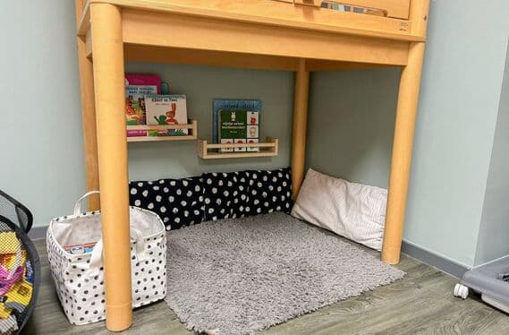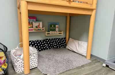 Elke dag start in onze ruime groepsruimte van 38 m², waar een grote tafel, verrijdbare bank en hoge stoelen staan. De kinderen kunnen zelf kiezen uit bakken met stapelblokken, Duplo en auto’s, terwijl de allerkleinsten veilig spelen in een lage grondbox. Een aparte speelruimte van 18 m² biedt een houten keukentje, verkleedkleren en een klimrek met glijbaan voor fantasierijk spel. De hal fungeert als extra leeshoek of thematische activiteitenplek.