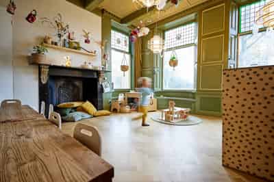 Binnen in onze ruime villa is alles ingericht op de ontwikkeling van jonge kinderen. We hebben aparte groepen voor baby's tot 1,5 jaar, dreumesen tot 2,5 jaar en peutergroepen voor de allerkleinsten. Elke groep heeft zijn eigen knusse slaapkamer waar kinderen rustig kunnen slapen. Onze pedagogisch medewerkers creëren een huiselijke, veilige sfeer waar kinderen zich thuis voelen. We werken met boeiende thema’s en organiseren creatieve activiteiten zoals knippen en plakken, koken en bakken in ons atelier. Ook yoga en sport & spel maken we regelmatig mee.