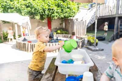 De locatie aan de Veenkade is ruim en huiselijk ingericht met warme kleuren en natuurlijke, duurzame materialen. Aangrenzend aan de locatie vind je een grote tuin, waar de kinderen dagelijks buitenspelen. De tuin grenst aan Kinderboerderij ‘t Beestenspul en heeft een doorkijk of eigen toegangsdeur naar de boerderij! Knutselen en schilderen doen wij naast de daarvoor ontwikkelde producten ook graag met elementen uit de natuur zoals dennenappels, bladeren en modder. Iedere week is er yoga- en een muziekles voor de kinderen.