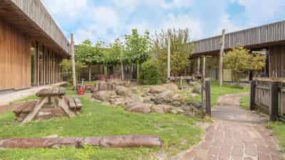 Onze ruime, groene tuin is onze trots! Kinderen ervaren buiten meer vrijheid en ontwikkelen meer zelfstandigheid. In onze ontdektuin kunnen kinderen zich verstoppen, samen spelen of juist even alleen zijn. De tuin is voorzien van natuurlijke elementen zoals heuvels, een waterbaan, een bruggetje met watervalletjes, zand, schelpen en echt gras. Door de glazen pui is de tuin vanuit alle groepsruimtes zichtbaar, waardoor de buitenwereld altijd dichtbij blijft.