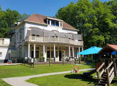 Onze locatie ligt aan de rand van het dorp, omringd door weilanden en een grote groene tuin die direct aan het gebouw grenst. Buiten wacht een zandbak, klimbult met glijbaan, buitenfontein en een grasveld waar kinderen vrij kunnen rennen en ontdekken. Op ons erf lopen kippen, konijnen en in het voorjaar schapen met lammetjes; de kinderen mogen helpen voeren en leren zo op een natuurlijke manier omgaan met dieren. Bij mooi weer trekken we er met bolderwagens op uit over het platteland. Ook de allerkleinsten slapen overdag buiten in speciale buitenbedjes: frisse lucht zorgt voor een diepere en langere rust.
