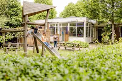 Bij ons draait alles om veilige vertrouwdheid. Baby’s verkennen in hun eigen afgeschermde tuindeel de buitenwereld, terwijl oudere kinderen ravotten in de grote groene tuin of spelen in één van onze zandbakken – waarvan er één overdekt is, zodat ook bij miezerig weer het buitenspel gewoon doorgaat. Vanuit elke groep is de tuin direct toegankelijk; dat geeft rust en maakt de overgang van binnen naar buiten speels en vanzelfsprekend.
