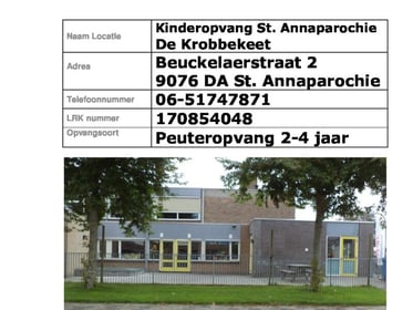Welkom bij KDV St. Annaparochie De Krobbekeet, een warme en veilige plek voor kinderen van 0 tot 4 jaar in het hart van Sint-Annen. Ons kinderdagverblijf, onderdeel van Vereniging Kids First, biedt opvang aan maximaal 16 kinderen in een huiselijke sfeer waar ieder kind de ruimte krijgt om te groeien en te bloeien. Sinds 2014 zijn wij officieel geregistreerd in het Landelijk Register Kinderopvang (LRK), waardoor ouders kinderopvangtoeslag kunnen aanvragen.