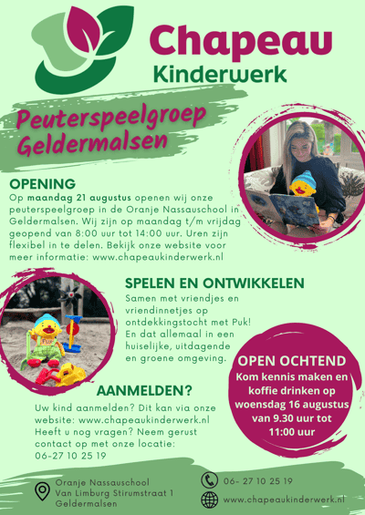 Welkom bij Peuterspeelgroep Chapeau Geldermalsen, gevestigd in hartje Geldermalsen aan de Van Limburg Stirumstraat 1. Vanaf 21 augustus 2023 staan wij elke werkdag klaar om peuters van 2 tot 4 jaar in een huiselijke, veilige sfeer op te vangen. Wij bieden maximaal 16 plaatsen in twee horizontale peutergroepen, waardoor uw kind de rust en aandacht krijgt die het verdient.