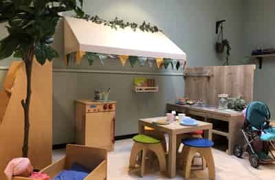 Buiten beschikken we over een eigen omheind speelterrein met uitdagende speeltoestellen, een moestuin en voldoende ruimte voor sport en spel. Bij mooi weer eten we buiten en organiseren we activiteiten zoals trefbal, voetbal en natuurexcursies. Binnen kunnen kinderen knutselen, bouwen, spelletjes doen of gewoon even uitrusten in onze rusthoek.