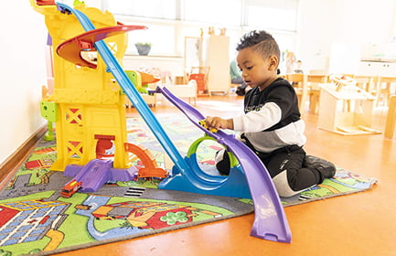 Onze speelruimtes zijn zorgvuldig ingericht met speelhoeken die aansluiten bij het thema van dat moment. Bij elk thema staat een boek centraal. We geloven dat jonge kinderen het meeste leren door zelf actief bezig te zijn met ‘echte’ zaken die uitnodigen tot experimenteren en ontdekken. Op deze manier komen alle ontwikkelingsgebieden gedurende het jaar aan bod.